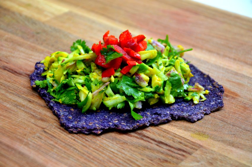 Avokádová PIZZA je jednou z našich TOP stálic v našem bistRAW. Základní sušená pizza placka je z červeného zelí a českého kmínu, které ji dává nejenom nádhernou fialovou barvu, ale i skvělou chuť. Na tuto PIZZA placku dáváme dokonale kontrastní chuť naší hořčice, avokáda, cibulky, koriandru a cukety.